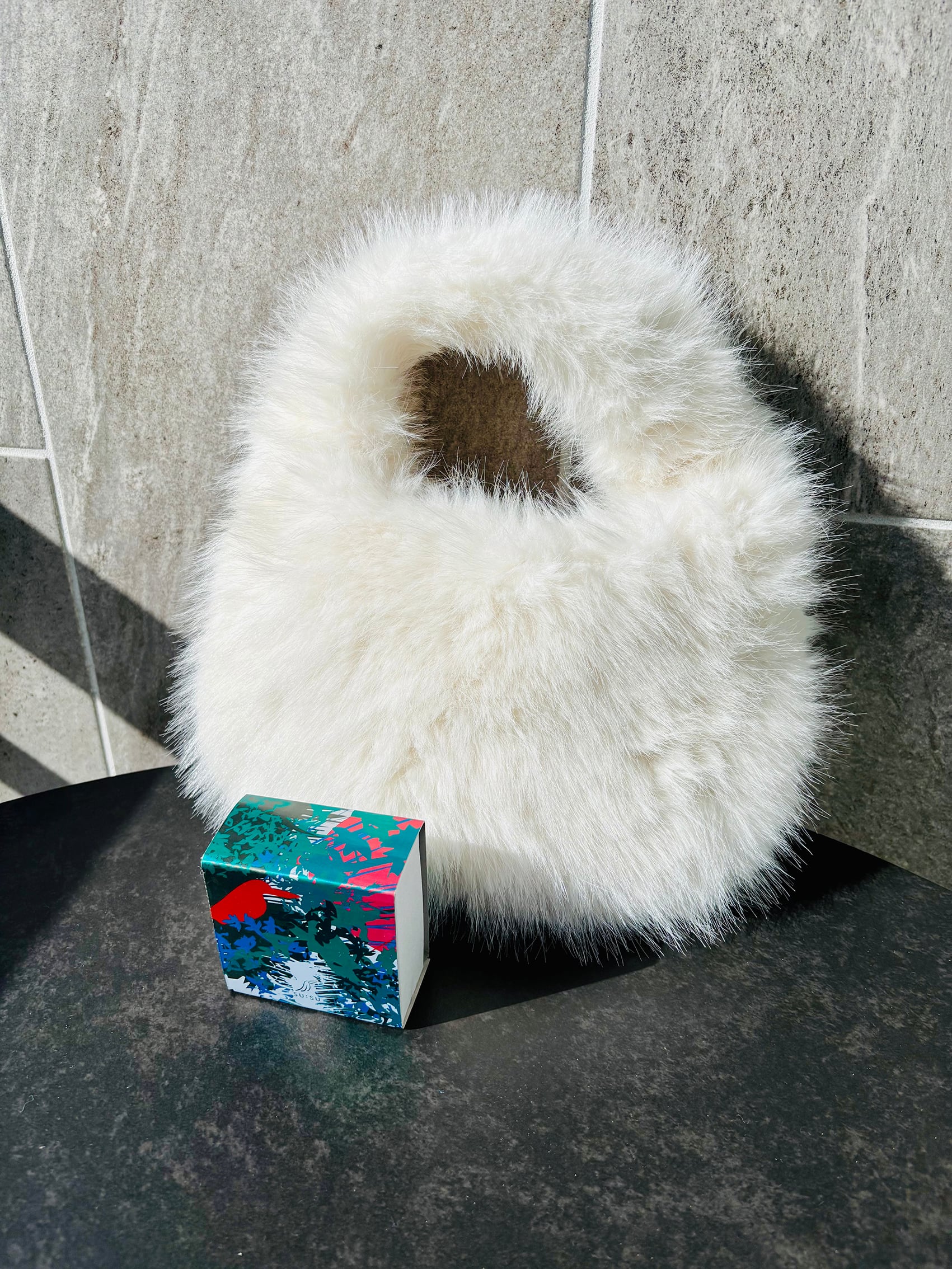 お買い上げの方にホワイトの「エコファーのミニバッグ」をプレゼントいたします。